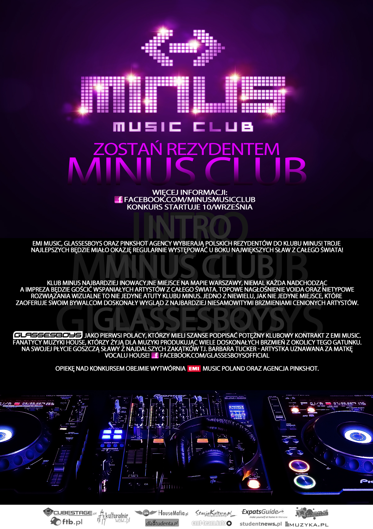EMI Music, Glassesboys oraz PinkShot Agency wybierają Polskich rezydentów do klubu Minus! Troje najlepszych będzie miało okazję regularnie występować u boku największych sław z całego Świata!